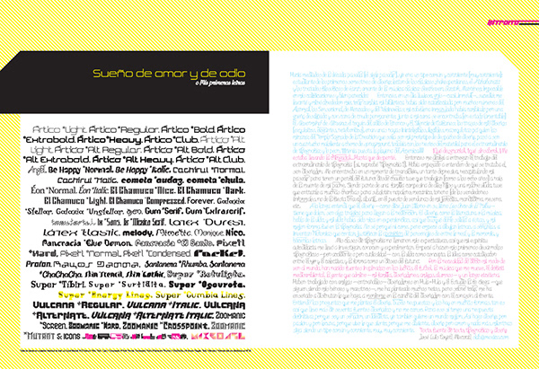 In 2004, I was invited for the mexican design magazine ENEO to be published with a review of my typographic work. They gave me the chance to write my own text and design the spread. So, I just wrote my text and I decide not just to design the pages that they gave me, also the body type of that. So, I just started to develop something intricate, complex, with the purpose to do a very unique body text, and the final result was a text with a lot of different letter from each other, one by one placed specially, just as the old printers of movable type, but in a digital way, with unique ligatures, a very visual words and with unique treatments. It takes a long time but I got something that I'm very proud to show.